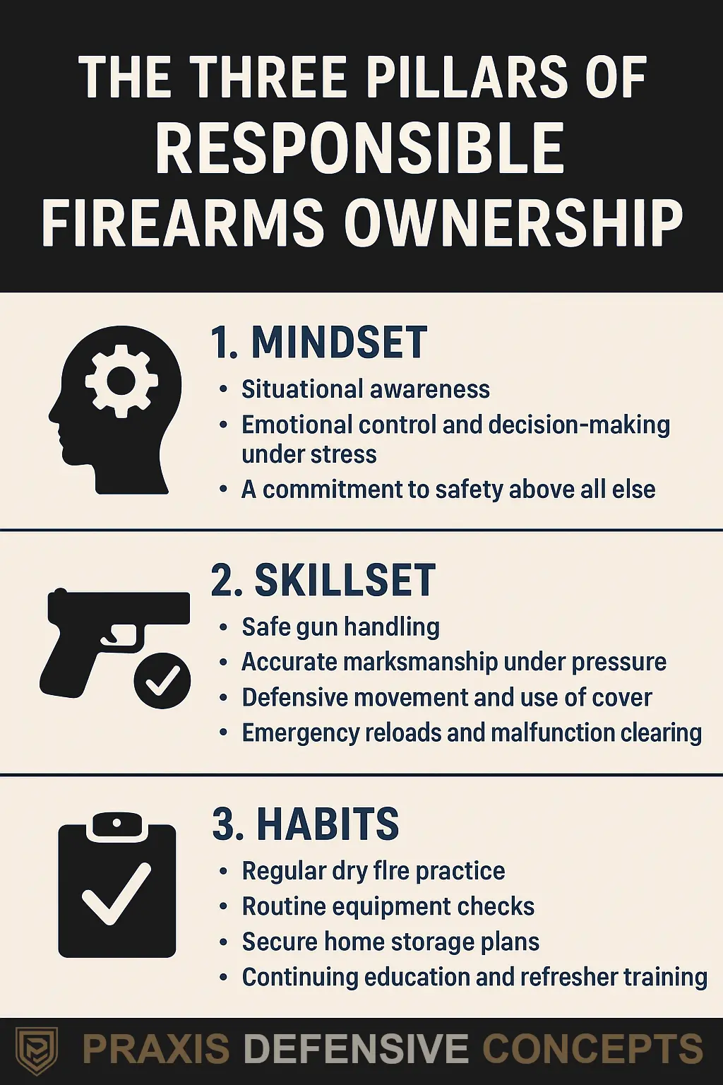In today's world, responsible firearm ownership involves more than just owning a gun. It requires developing the right mindset, skills, and habits to protect yourself and others safely. At Praxis Defensive Concepts, we call these the Three Pillars of Responsible Ownership.
